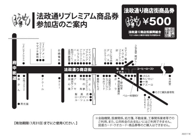 法政通り商店街のお店で利用できる使い勝手の良い商品券です。